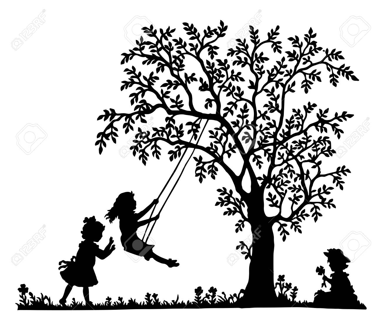 Two Girls Are Playing On A Tree Swing And One Girl Is Sitting Near The Tree And Is Picking A Leaf Vintage Line Drawing Or Engraving Illustration Royalty Free Svg Cliparts Vectors